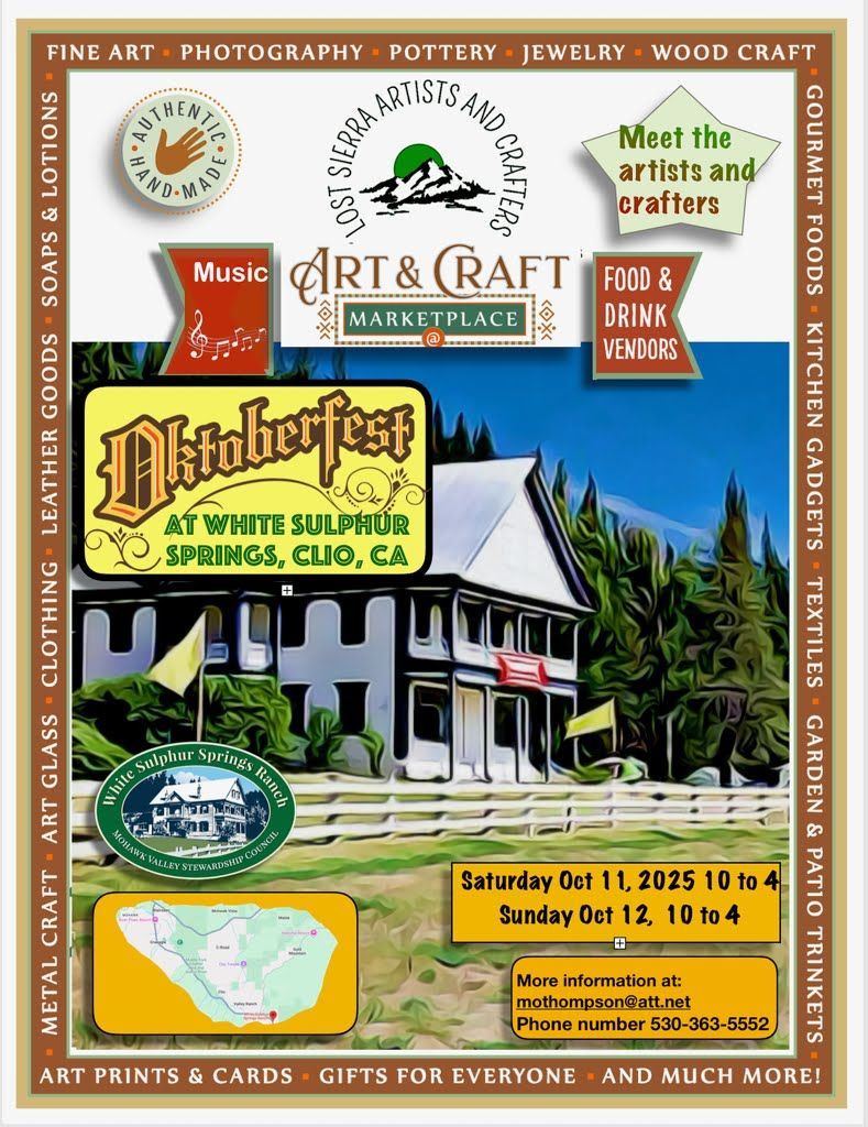 Mark your calendars for Saturday, October 11, and Sunday, October 12, 2025 (10 AM – 4 PM each day) and come celebrate fall in the Lost Sierra with an incredible Art & Craft Marketplace. Meet talented local artists and crafters, Enjoy food & drink vendors, Music to keep the festival spirit alive.