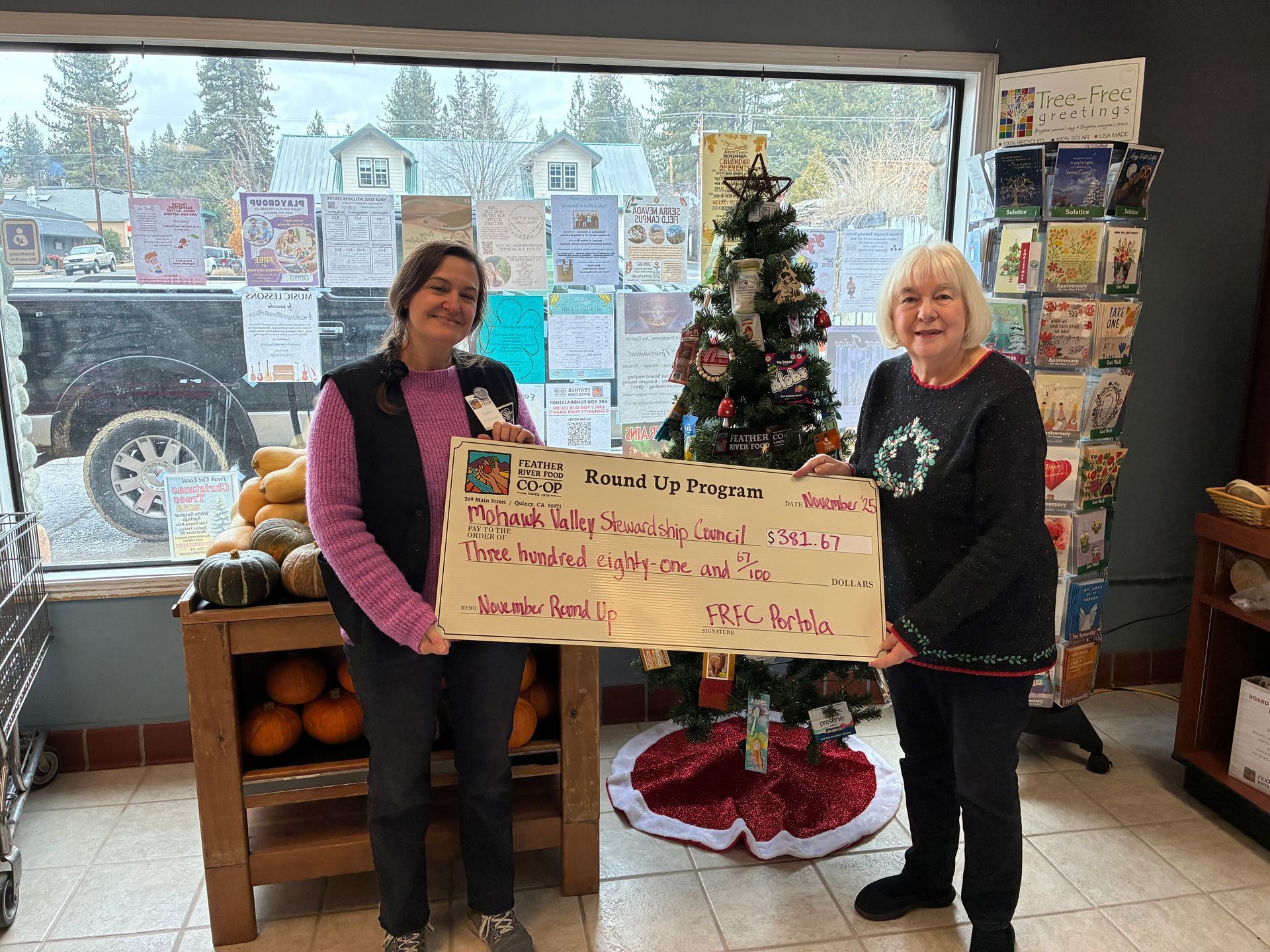 Mohawk Valley Stewardship Council Secretary, Nancy Meyers received a check today from Korin, Feather River Food Coop, Portola Store Manager, from their November 'Round Up at the Register' program! Thanks so much to the co-op and to our wonderful community that donated during checkout!